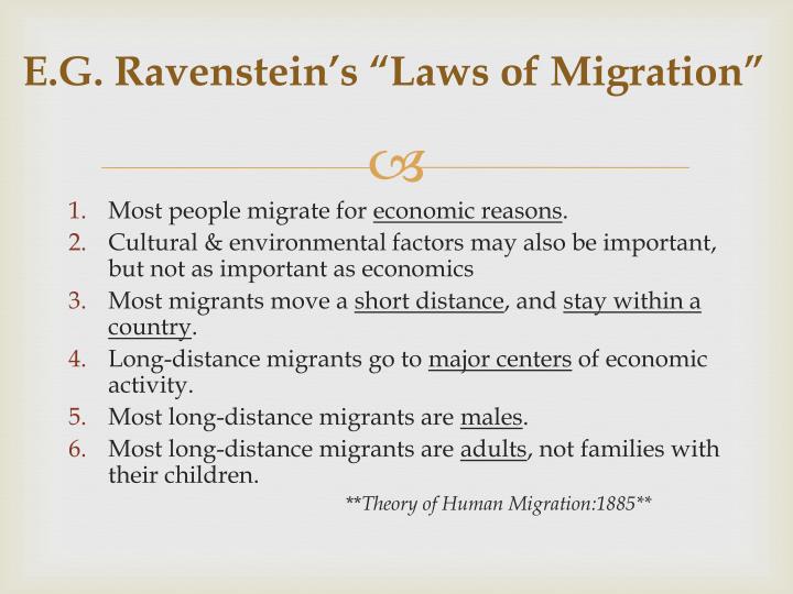 Every migration flow generates a return or counter migration. Fifth, ravenstein's list of laws in the 1889 article was preceded by a discussion of the motives for migration. Aug 08, 2019 · while the gravity model was created to anticipate migration between cities (and we can expect that more people migrate between la and nyc than between el paso and tucson), it can also be used to anticipate the traffic between two places, the number of telephone calls, the transportation of goods and mail, and other types of movement between places. Population and migration patterns and processes. The following was a standard list after ernst georg ravenstein's proposal in the 1880s: